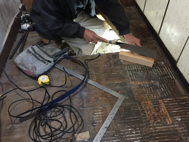 現状の床が、ふわふわしていましたが、床下地の根太はしっかりしていたので、既存の床の上から新しいフローリングの重ね張りです。 まずは、使っていない収納庫部分の下地造作からです。