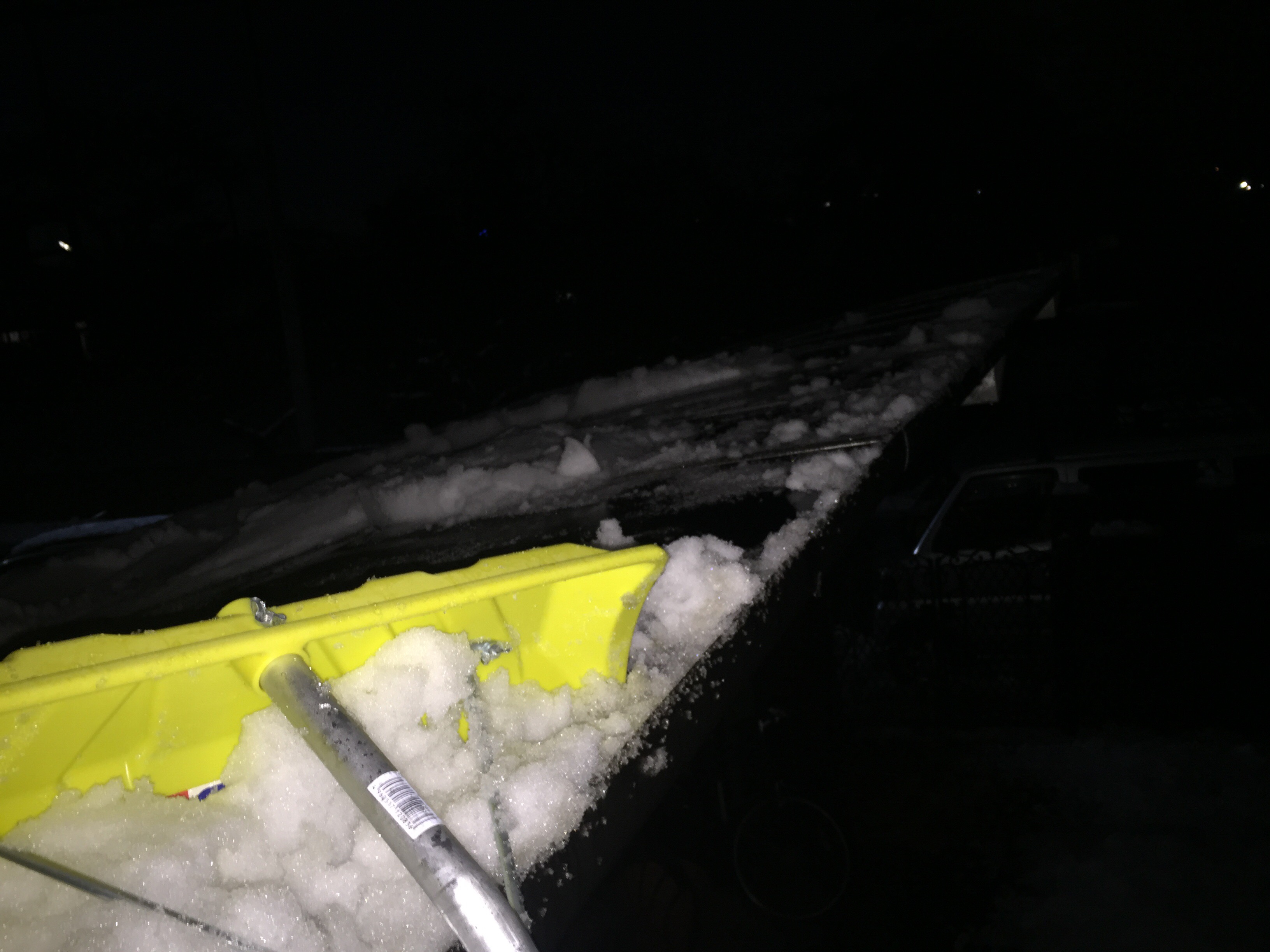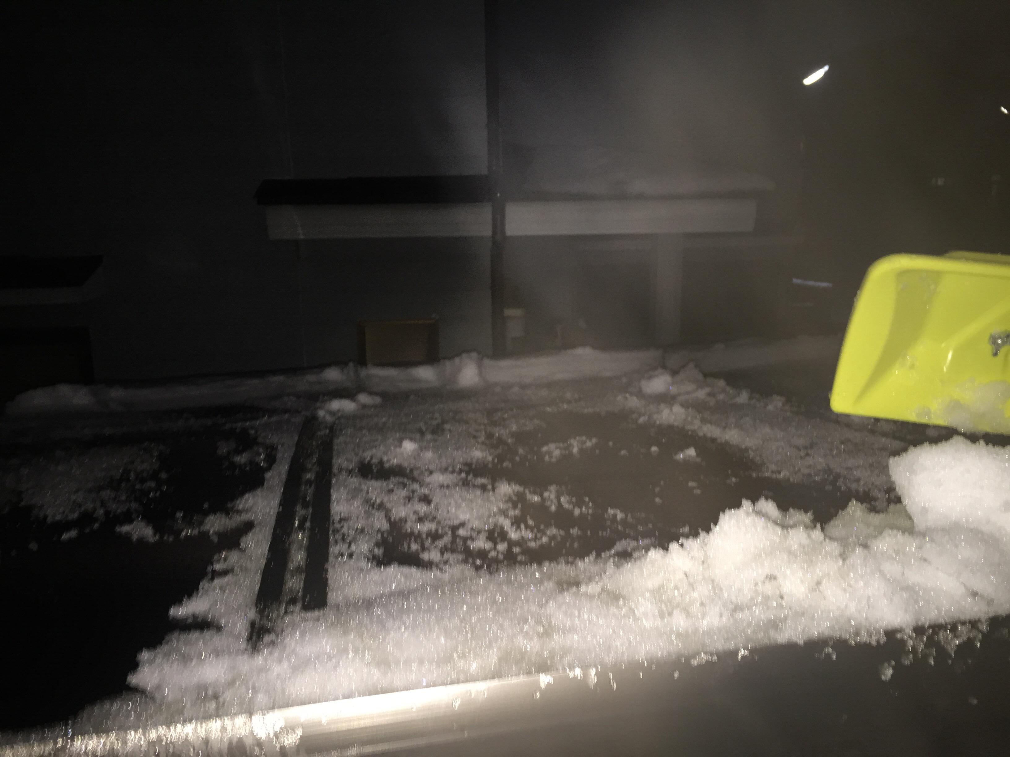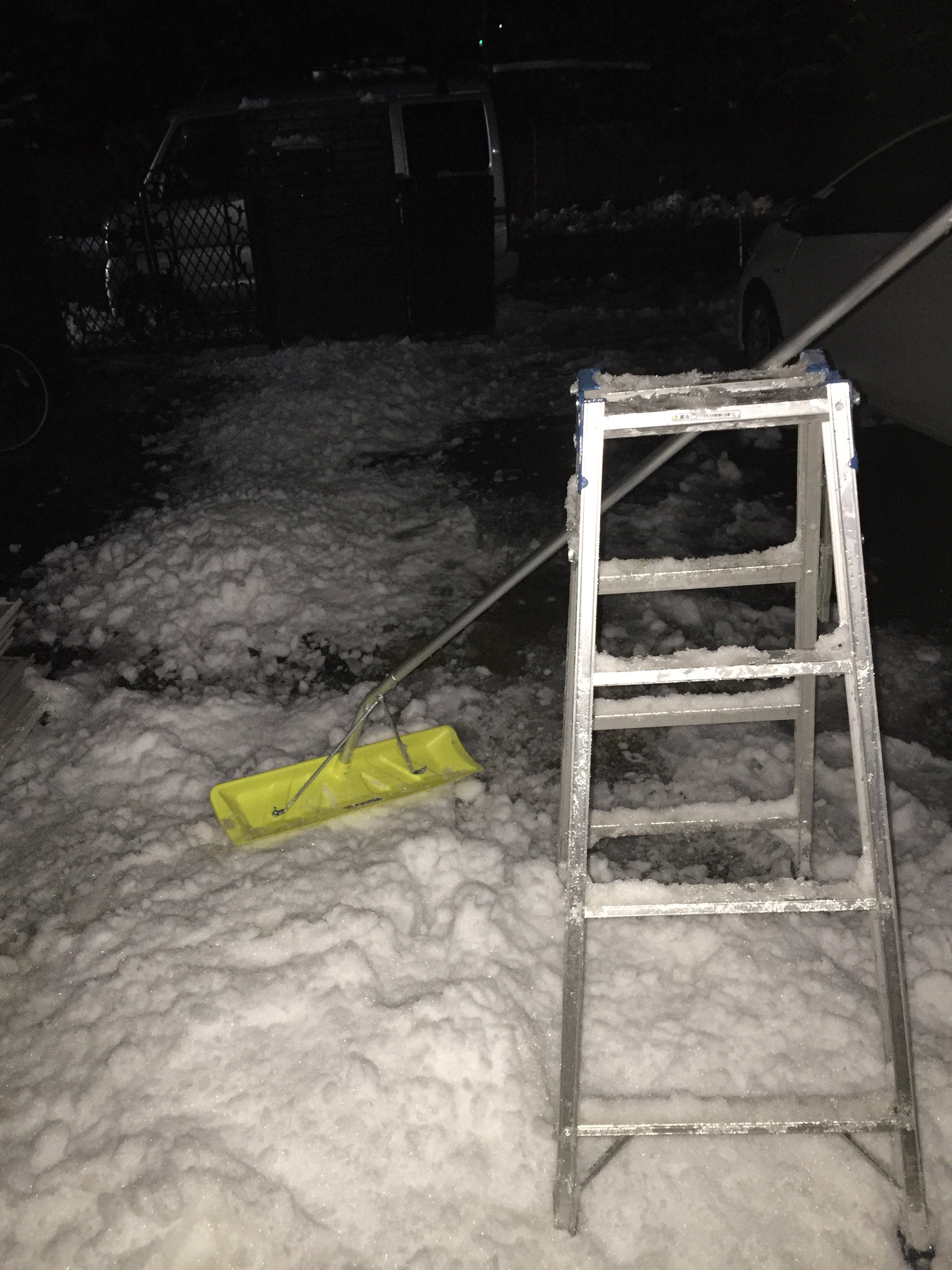 このカーポートだけで、1〜2トンの雪が乗っかっていました。水を含んだ雪の場合は、通常の雪の3倍〜4倍以上の 重量に換算して雪降ろしをしてください。又雪降ろし作業をする際には、まとまって雪が落ちてくる場合が、ほとんどです、体を避けながら作業してください。大怪我される方も沢山おります。数トンの雪が、自分に落ちてくることも考えながらの作業をお願い致します。