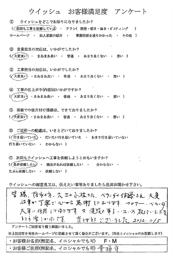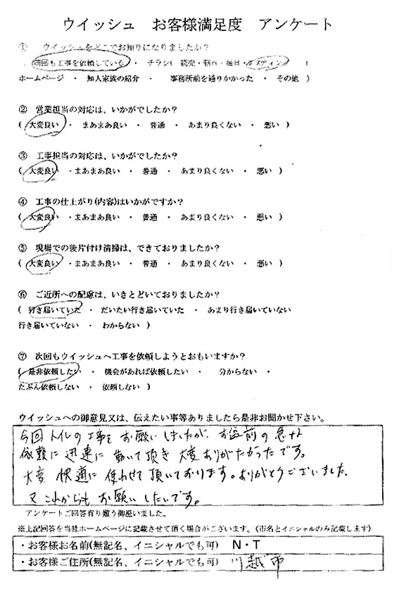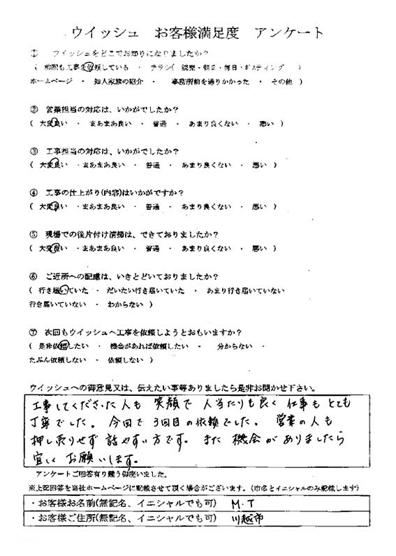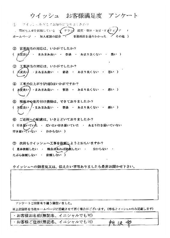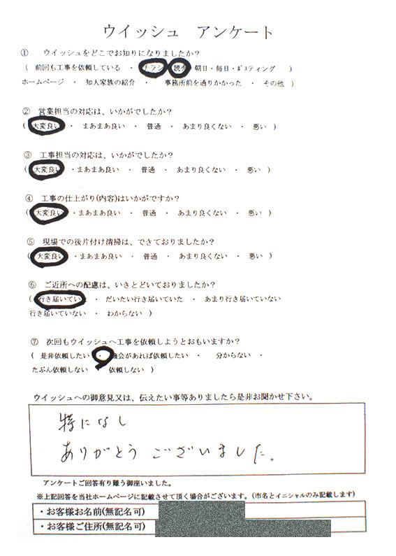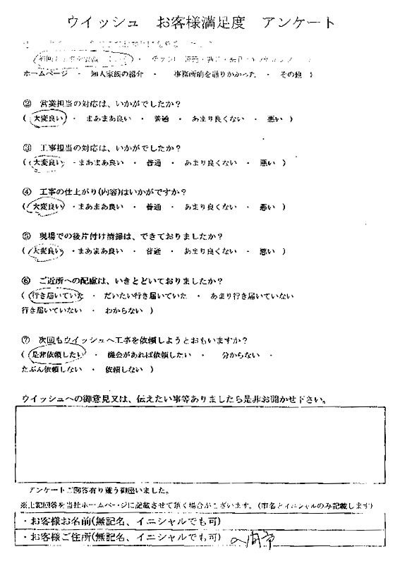 ウィッシュでは責任施工の確認として、お客様すべての方にアンケートをいただいています。